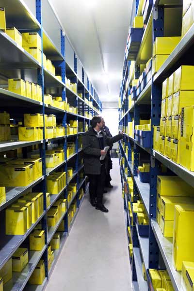 Vi var på besøg i Hamm/Sieg, hvor Hirsch netop har færdiggjort opførelsen af et moderne logistikcenter. Florian Bargon, som er ansat som lagermedarbejder, tog sig tid til at vise os rundt på det store lager. Vi var selvfølgelig især begejstrede for de gule hylder (se nedenfor), hvor mere end 12.500 Triscan varenumre er indlagret, herunder styretøjsdele, hjullejer, sensorer såvel som en række kabler.